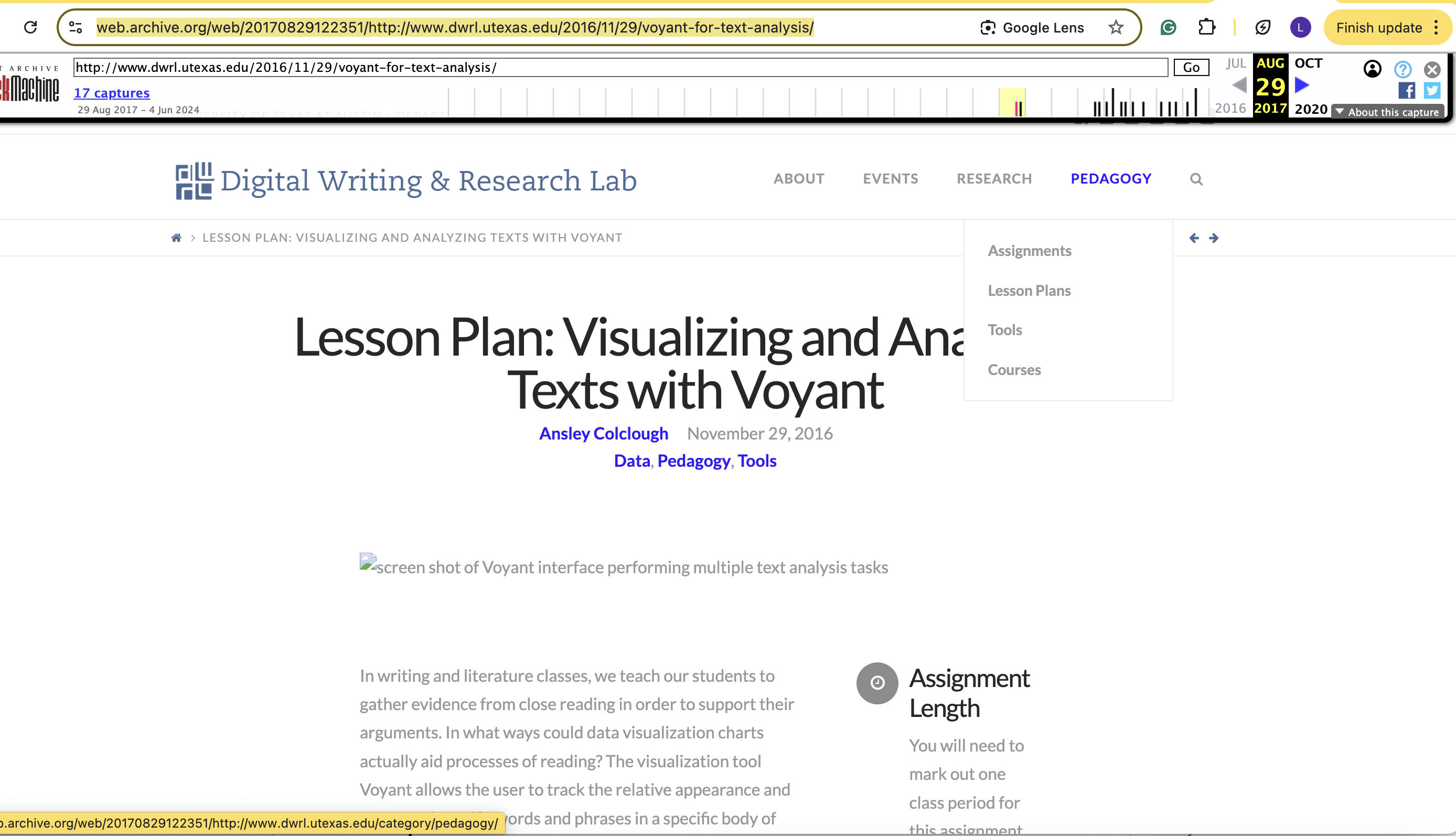 1. This screenshot covers the webpage interface on 29 August 2017 looks like on The Wayback Machine. Unfortunately, due to apparent technical difficulties in reformatting the DWRL website (that occurred after I moved on to a different academic appointment), the original link to my lesson plan is no longer supported by the website format, thus forcing me to use the Wayback version to authenticate the original publication.